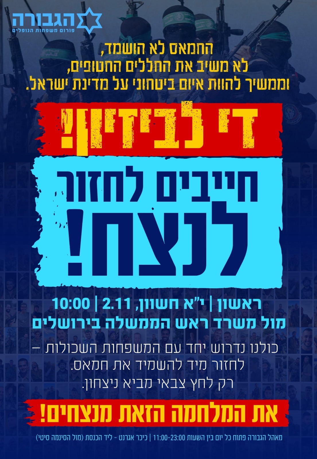 יהושע שני, אביו של סרן אורי מרדכי שני ז"ל ויו"ר פורום הגבורה, הודיע כי המשפחות השכולות יגיעו ביום ראשון בשעה 10:00 מול ישיבת הממשלה וידרשו מהממשלה לחזור לפעילות צבאית עצימה עד להשמדת חמאס.