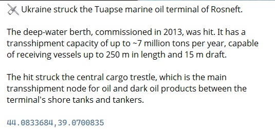 נמל יצוא הנפט בים השחור של רוסיה בטואפסה הותקף ע''י כטב''מים אוקראינים. מכלית עולה באש, ונזק משמעותי לתשתיות הנמל.