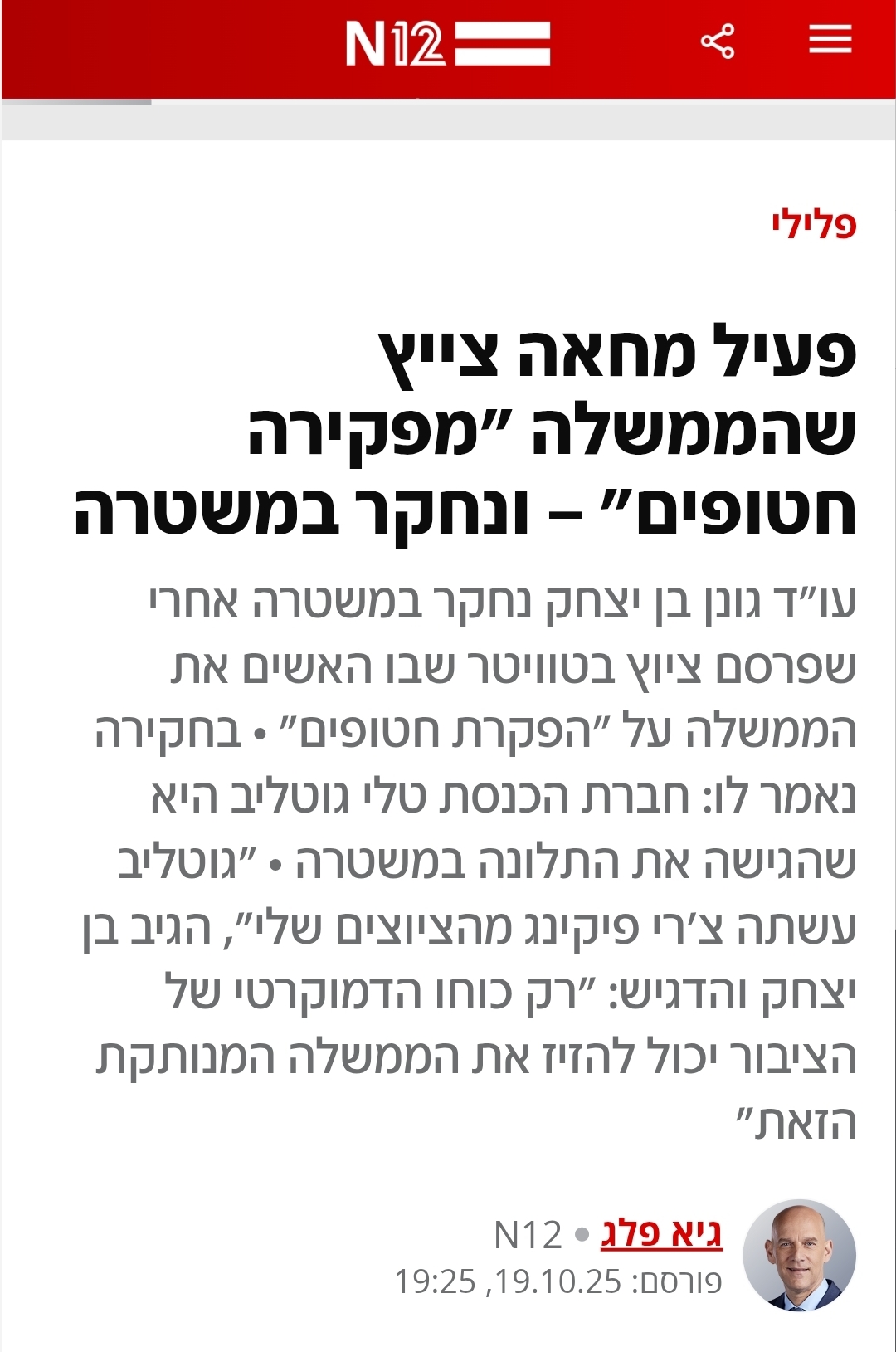 עורך הדין ופעיל המחאה גונן בן יצחק נחקר היום (ראשון) במשטרה על ציוץ שפרסם בטוויטר בחודש מאי האחרון. "הממשלה מפקירה את האזרחים וצריך להעיף אותה בכוח", כתב אז בן יצחק.